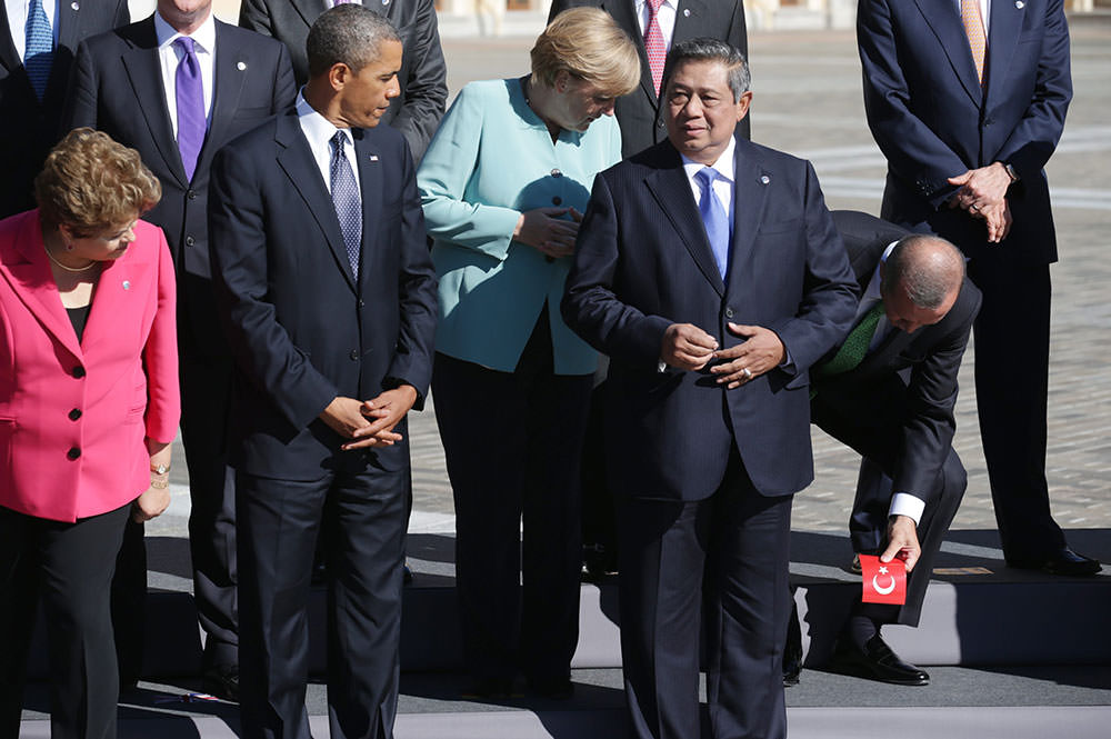 President Erdoğan was putting Turkish flag in his pocket in G-20 Summit 2013 Photo Shoot. |